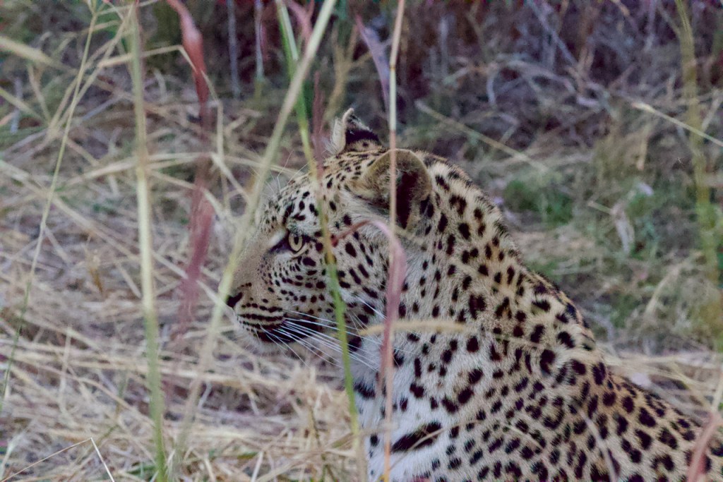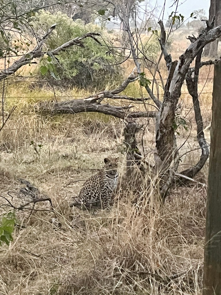 Arriving back at the lodge, we pull off the road on the outside of the camp’s elephant fence to watch a leopard that is heading in towards the camp. It is right outside the camp near room 10 and headed towards our rooms, 11 and 12. After getting some good photos, Lasty drives inside the camp fence and drives down a road we hadn’t previously been aware of to try and deliver us as close to our rooms as possible. He ends up positioning us right on the other side of the fence from the leopard and backing us in towards the foot trail. While this is happening one of the camp staff is escorting some new arrivals to room 10 and as they are walking by the leopard noticeably cranes his neck around the truck to get a better view of them, then bolts into the grass as we step off the truck much too close for his comfort 😬.