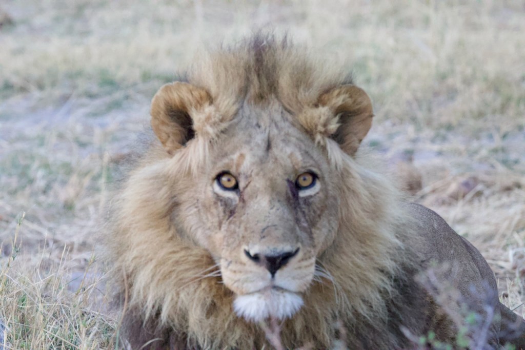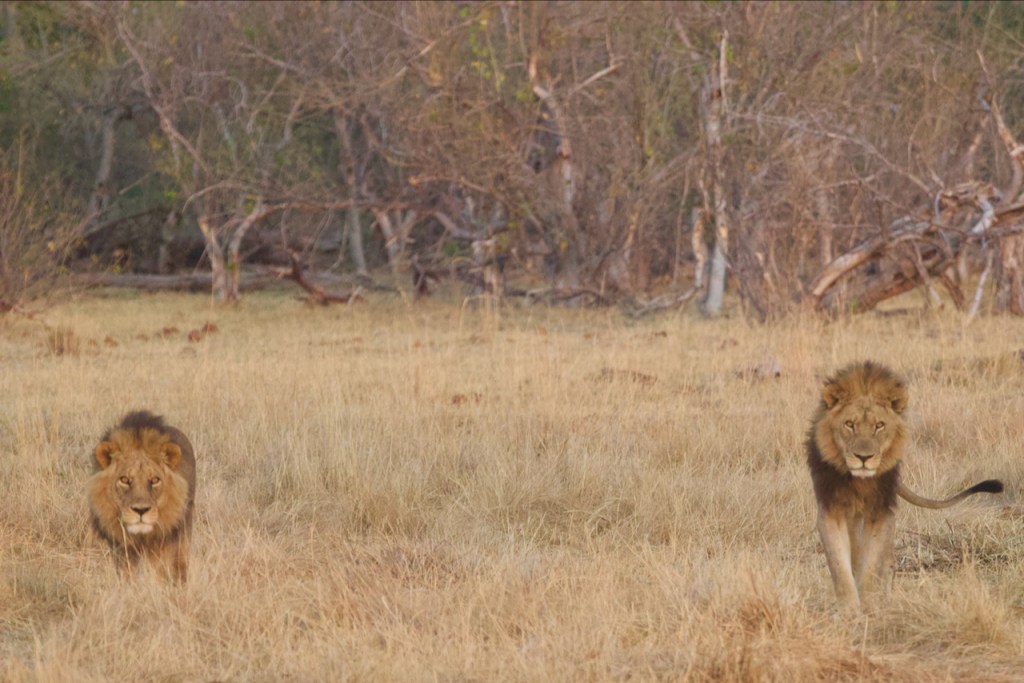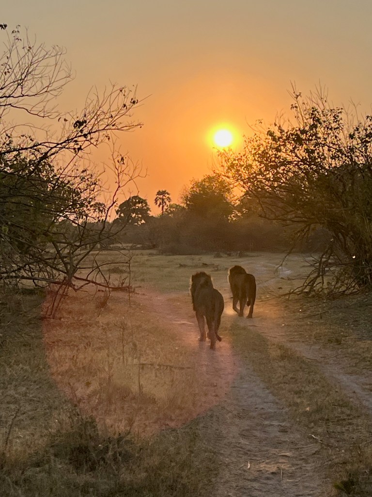 We go around to the far side of the lagoon in front on the camp to look for signs of the warthog kill from the night before. James has some sweet new night vision binoculars that we all get to look through. Looks exactly like Predator😂. We are just sitting, no engine, in the dark, listening. Paying attention to what nature is telling us. Lions roaring to the northeast. We head off. Travel for about 5 minutes then James stops the truck, kills the engine. We wait. James says “on average lions will roar every 7 minutes, but keep it to a minimum”. We hear lions roar. James starts the truck and we drive for a short while and kablam, two male lions within 30 minutes of starting off without any radio assist from other guides. We are very alone out here, not having seen another vehicle since James picked us up aside from a support truck that was delivering our lunch. This is safari!