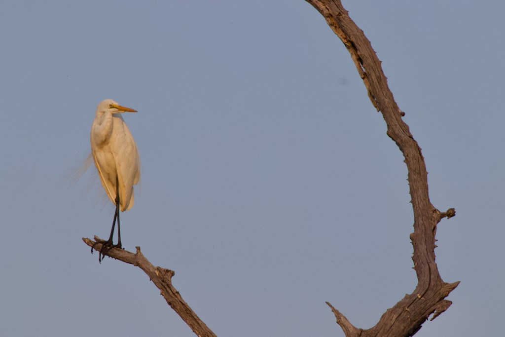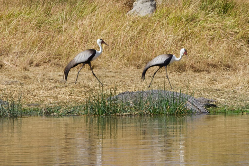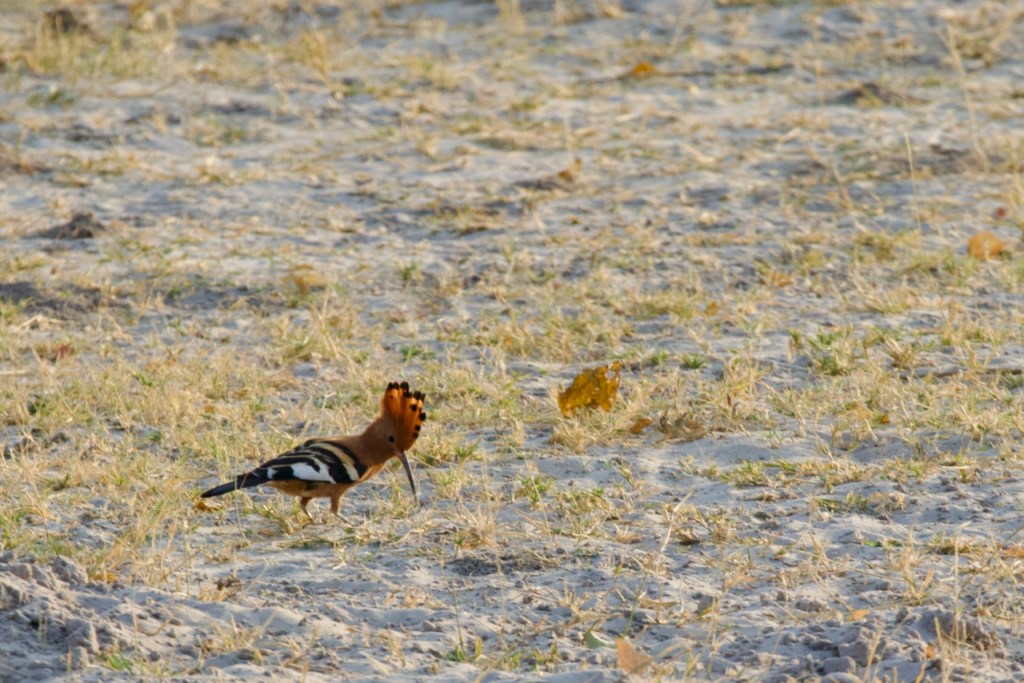 After breakfast we cruise around, looking for lions, leopards, etc. Plenty of lioness signs, but looks like they’ve traveled across an inaccessible part of a marsh. Signs of a leopard dragging a kill up into the bush. James gets out of the truck and walks into the bush for a while, comes back to report he didn’t find any definitive answer to the tracks. Lots of excellent birds.