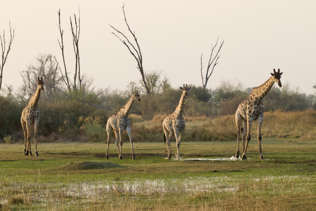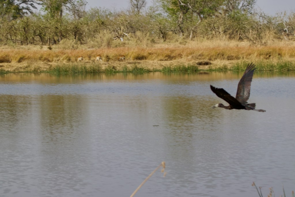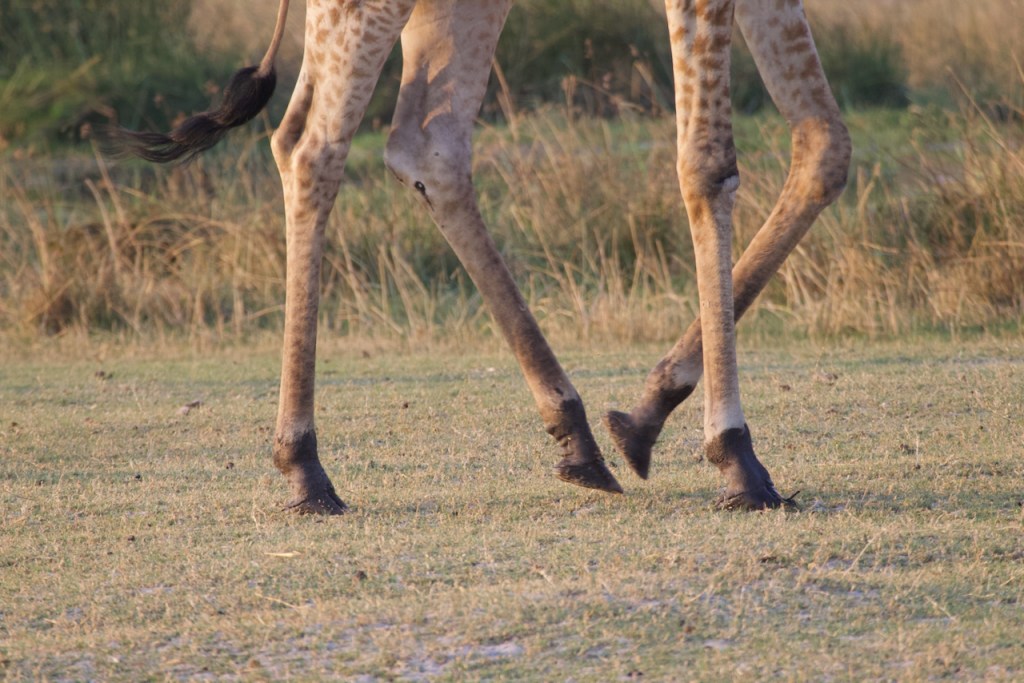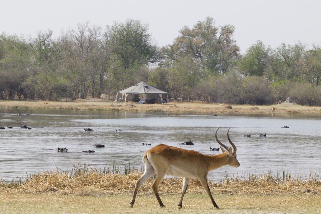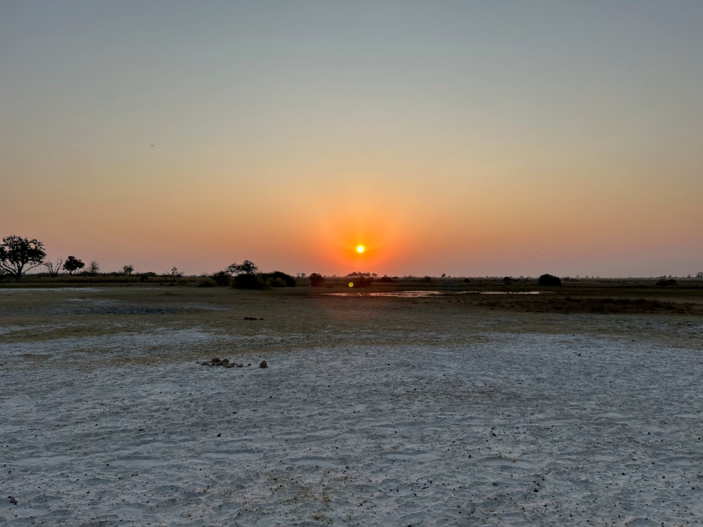 Back at camp we have a delicious lunch: beet, carrot, and feta salad, green salad, focaccia bread, and hake fish with an onion sauce. We hear a bit about how Botswana government has a desired to increase their food independence as a nation so have instituted several waves of bans on external produce without having sufficient farm capacity domestically to compensate. This means that there is a very healthy vegetable black market, mostly coming in from Zimbabwe, and so not all of our food this trip is strictly legal… The afternoon heat is vicious today, we take refuge in our tent wearing dampened kikois (think sarong) while a fan blows on us from the foot of the bed – bush AC. At 3:30 we get shower water hoisted for us, bathe, and meet at the central tent for fresh squeezed lemonade, sausage rolls, and bananas foster cake. We think they might be bulking us up to feed to the wildlife.