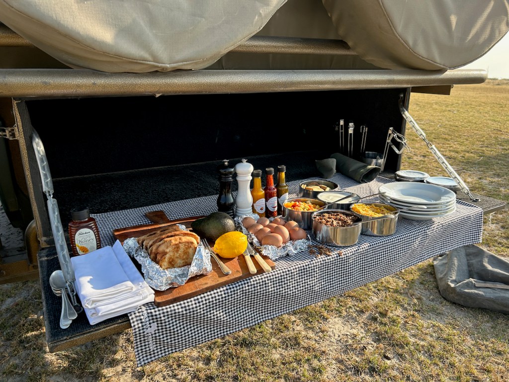 Breakfast time. James does a thorough sweep with the car of a nearby area looking for the lioness that he’s been seeing tracks of before parking in the middle of an open field with a lagoon filled with lechwes and hippos with elephants in the distance. Breakfast is DIY avocado toast, yogurt and various toppings, and hard boiled eggs with tea or coffee.